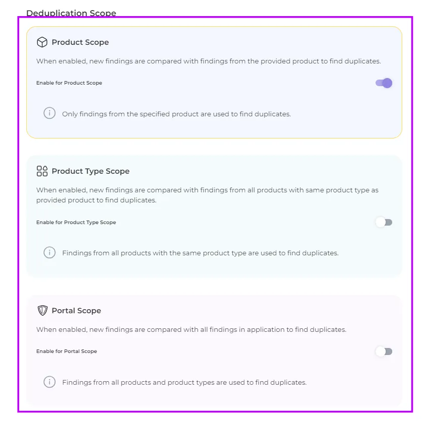 - Product scope: the results are compared with findings from the specified product to identify possible duplicates. The deduplication process is limited to detections from the specified product only.