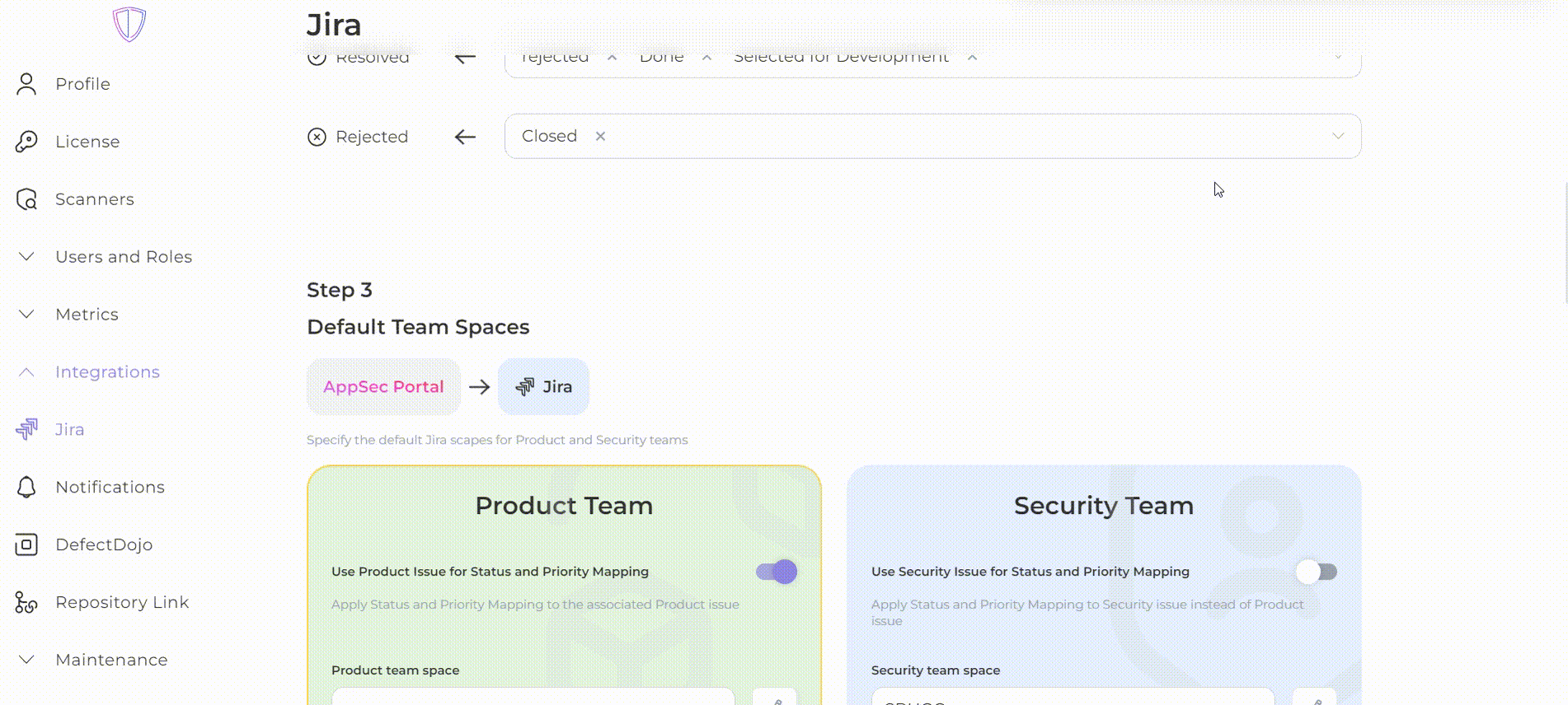 - Choose Product Team Space or Security Team Space for status and priority mapping and toggle the switch accordingly