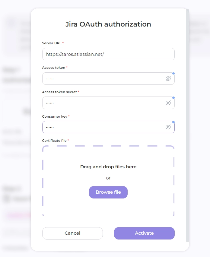- For OAuth, enter your Jira server URL, access token secret, access token secret, consumer key, and certificate file. To use Jira OAuth, you need to create an application link between Jira and AppSec Portal. You can find detailed instructions on how to create an application link here.