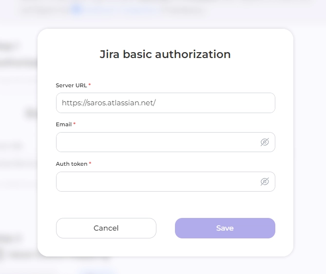 - For Вasic authorization, enter your Jira server URL, e-mail and Auth token: