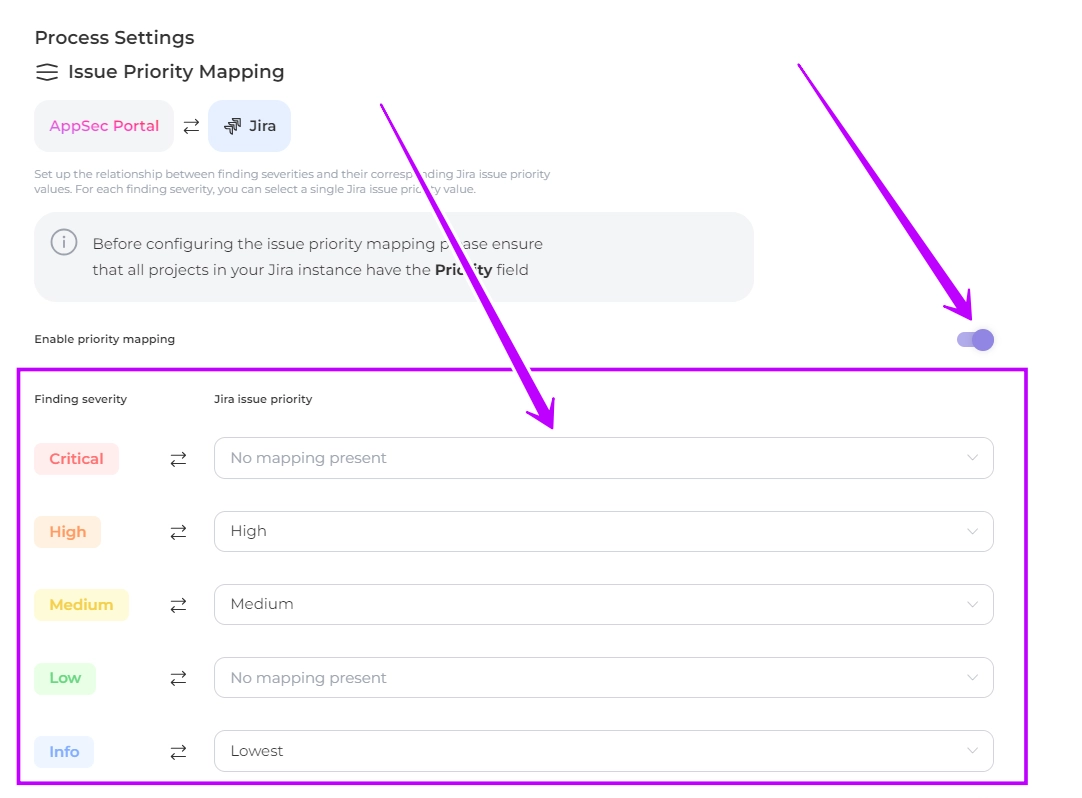 Optionally, establish a mapping between finding severity and Jira issue priority.