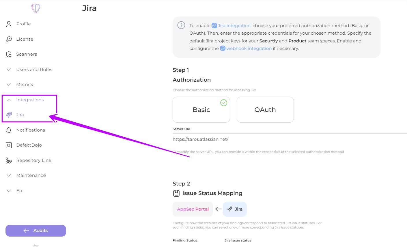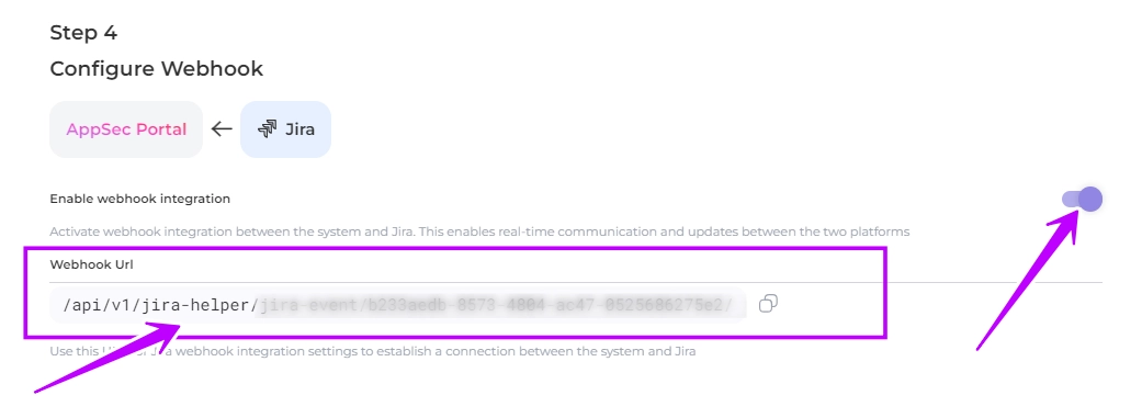 Enable webhook integration: Activate real-time communication and updates between AppSec portal and Jira by toggling the switch