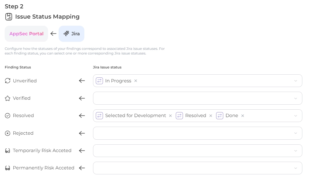 Select from dropdown list one or more issue statuses to be automatically set in Jira when findings statuses change.