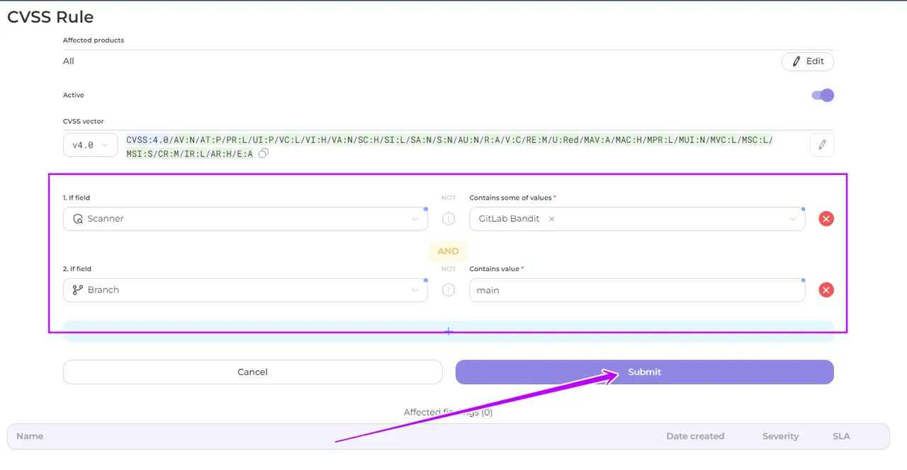 - Navigate to the CVSS section and click on the Create Rule button