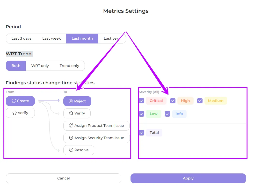 Customise the view of the metric view using the Findings Status Change Time Statistics section of the Metrics Settings.