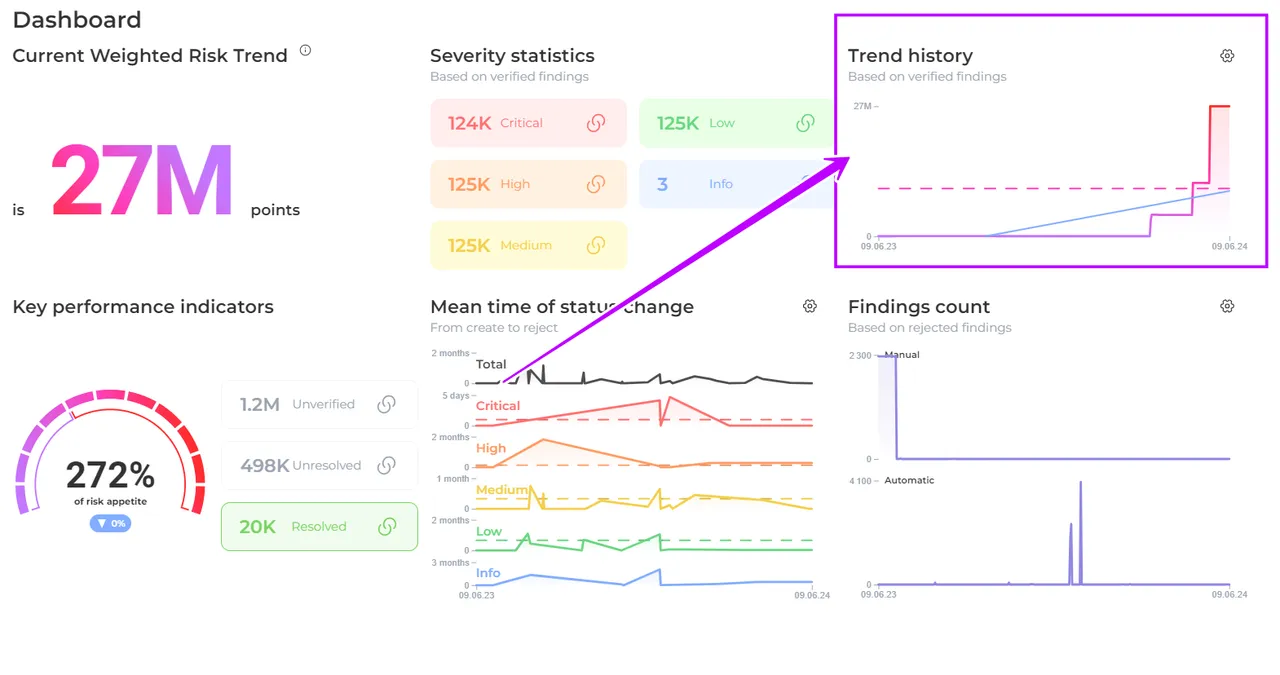 Weighted Risk Trend (WRT) metric empowers organizations to measure and track the state of security in a business-oriented manner. The General WRT is calculated by combining the WRT of each product, taking into account their respective severity weights, findings count, and business criticality assessments.