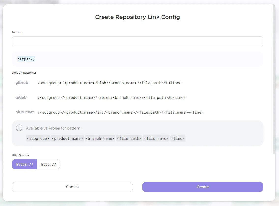 - select the URL pattern of your Git hosting service: choose from the Example patterns provided (available for GitHub, GitLab and Bitbucket) or create a new one in Pattern field;
