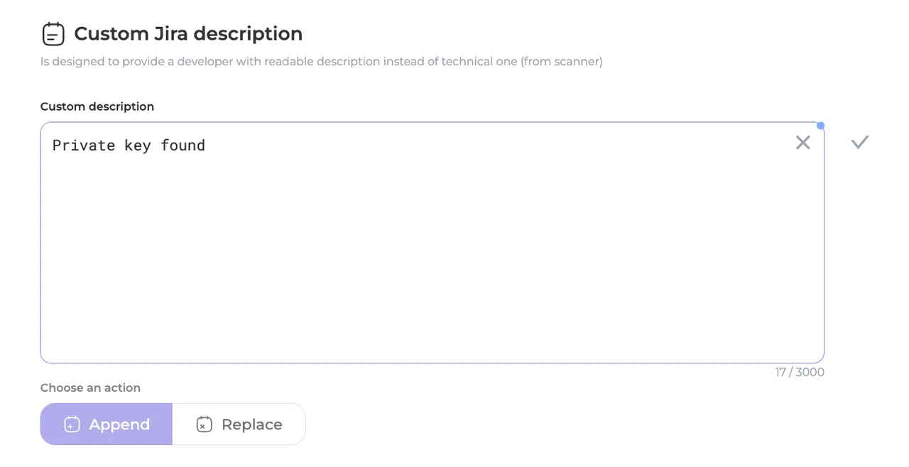 For instance, technical descriptions can be cluttered and difficult to understand, such as the display of a private RSA key. With the Custom Jira description feature, there are two options available - Append and Replace - for modifying the description.