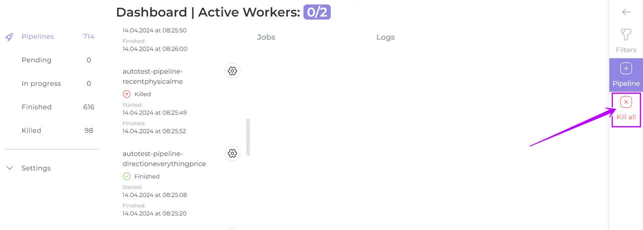 After all the jobs in your pipeline have finished their work, the status of the Pipeline will change from In progress to Finished