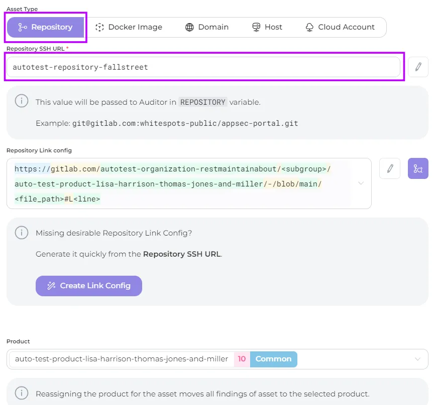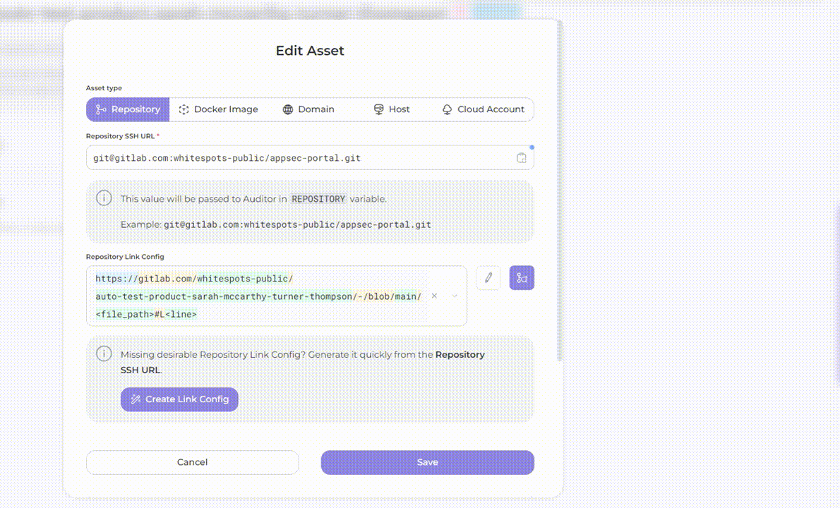 - Repository SSH URL: enter the address of your repository in a specific format, for example: git@gitlab.com:whitespots-public/appsec-portal.git