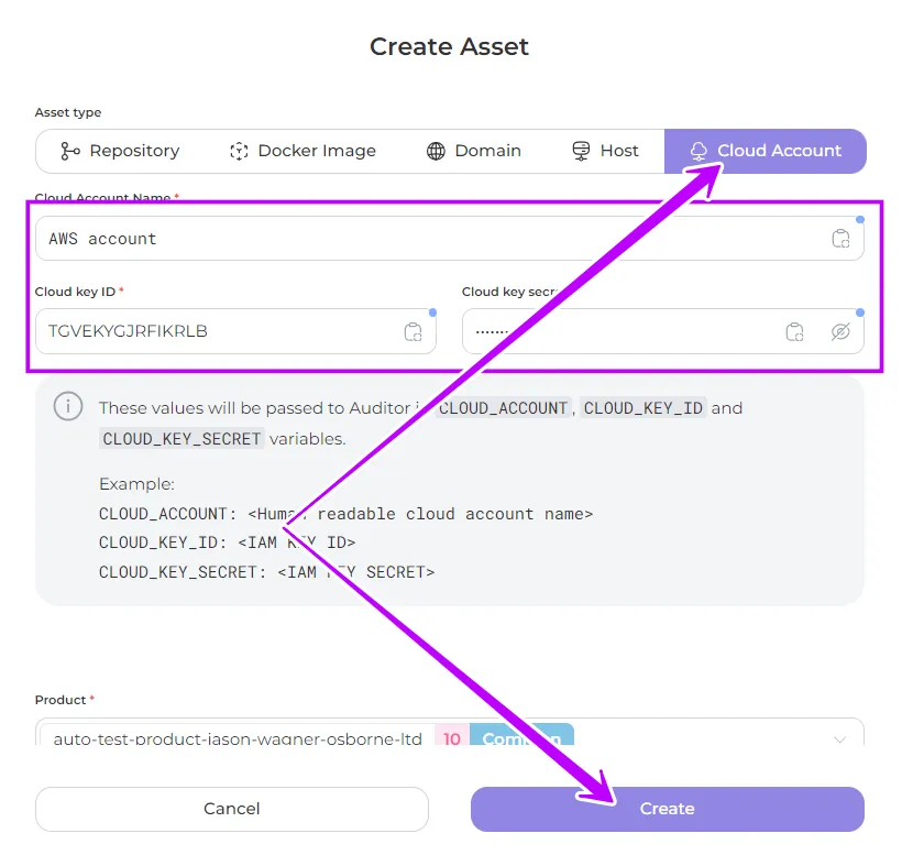 In the Cloud account tab enter the Cloud Account Name where your product is located, its Cloud key ID and Cloud key secret and click Create