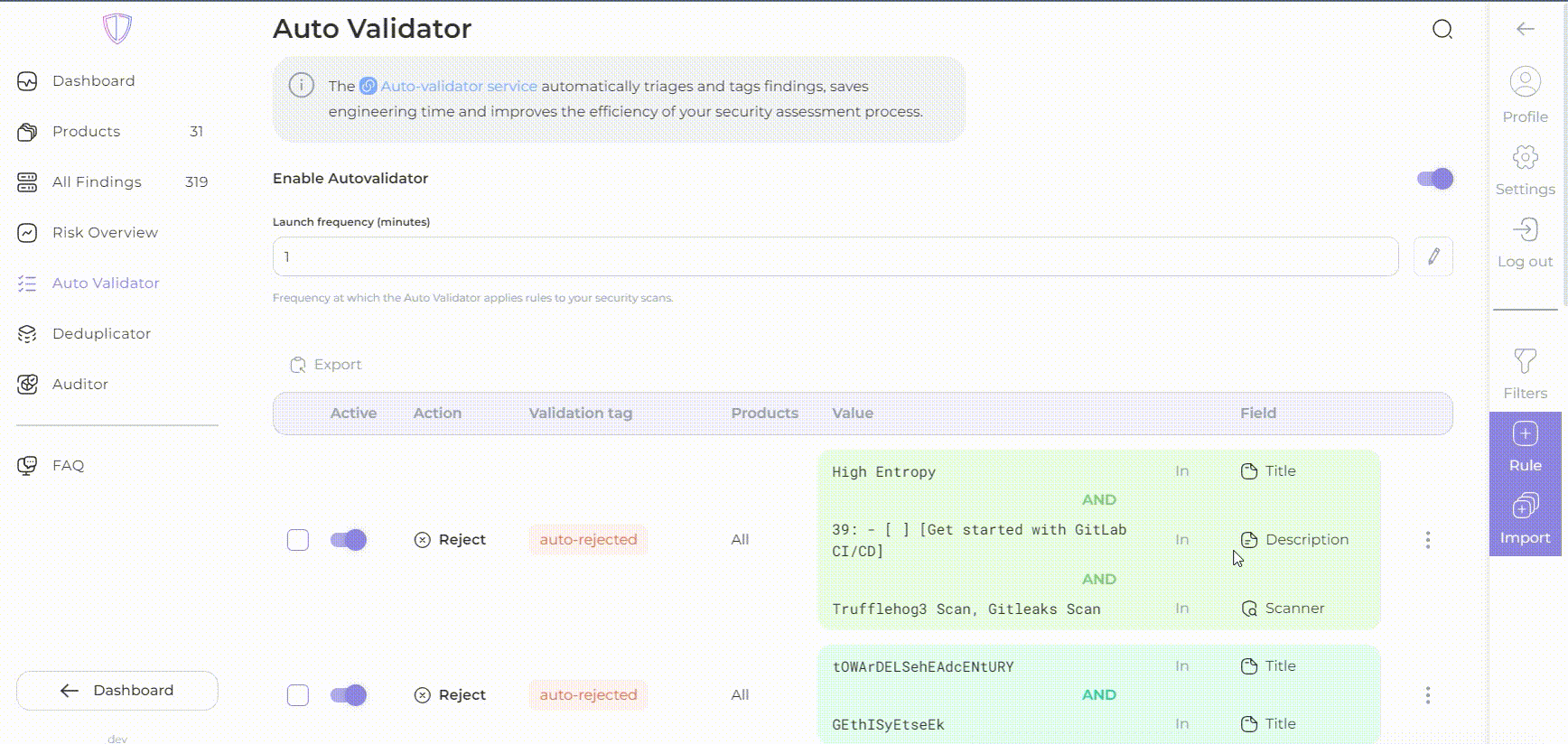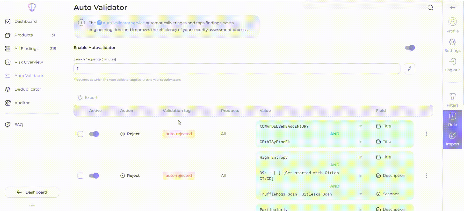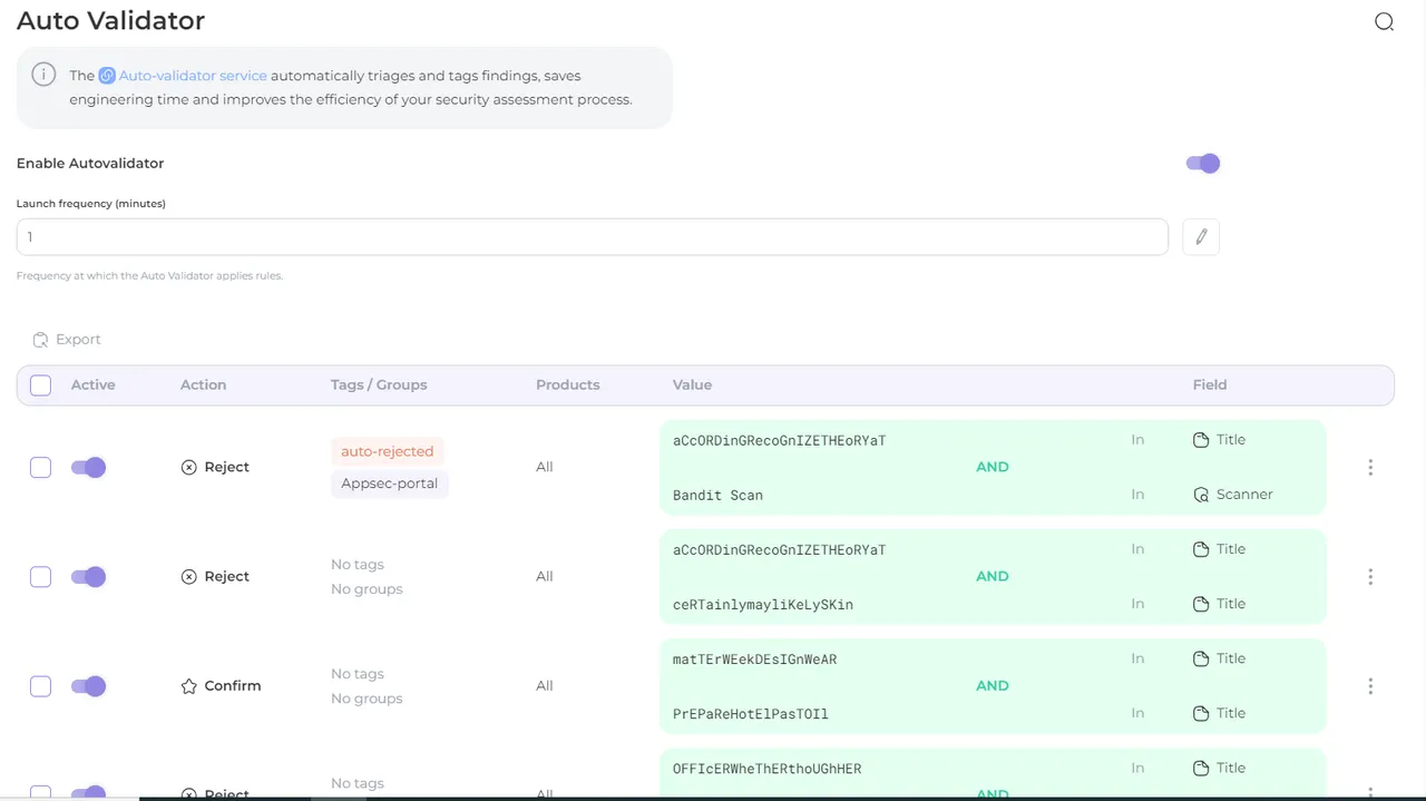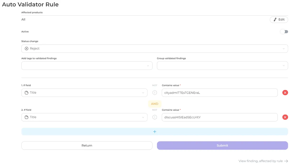 - decide what to do with findings if the right conditions are met: reject, confirm, no, temporarily accept risk or permamently accept risk . If сonfirm is selected, the validator will automatically create corresponding tasks in Jira. If reject is selected, findings will be excluded from future checks. If No is selected, entered tag or/and group will be assigned to findings in accordance with rule;