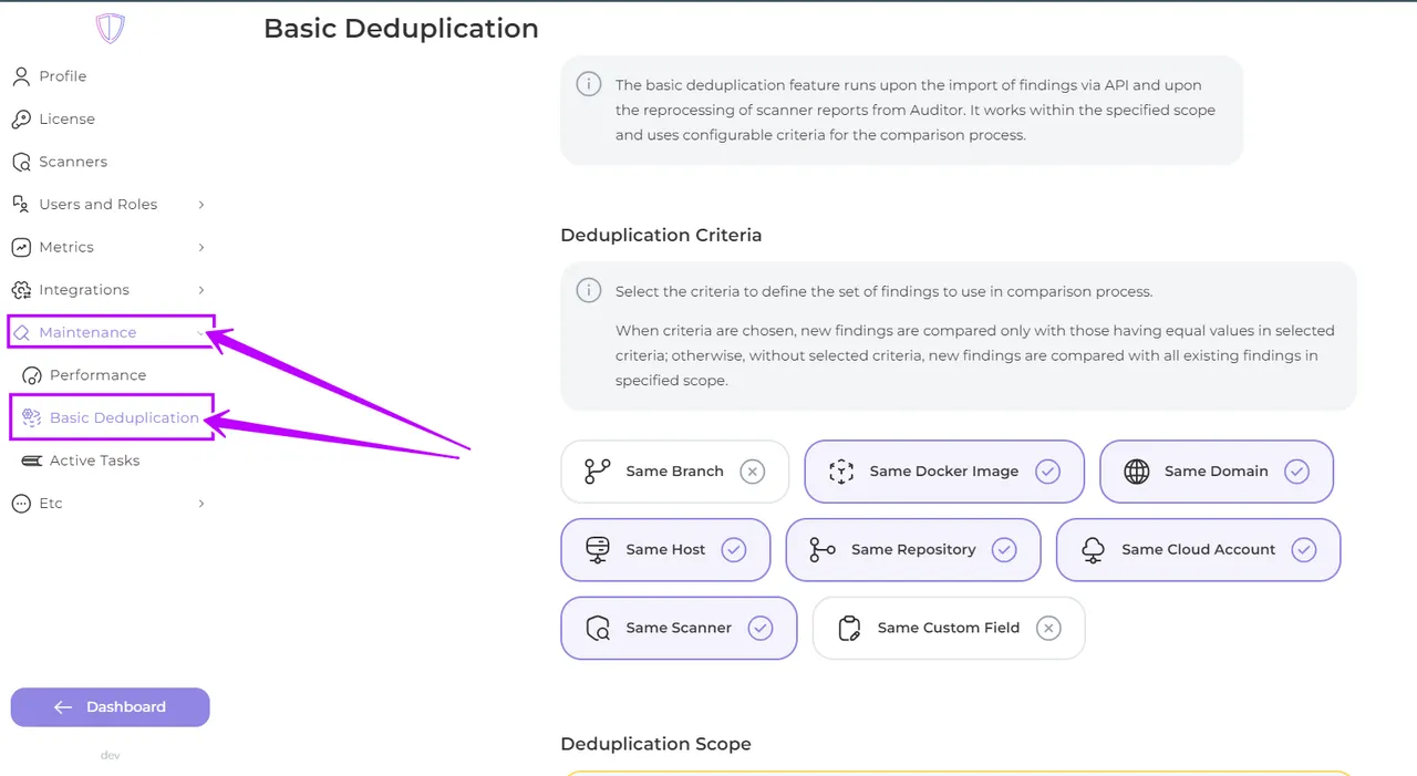 Basic deduplication works during report import, scanner report post-processing and Auditor execution, within the specified scope and using configurable matching criteria.