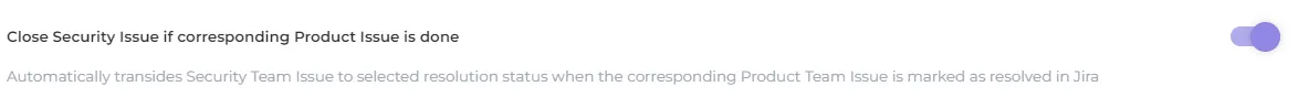 Choose this option to automatically transition Security Team Issues to a selected resolution status when the corresponding Product Team Issue is marked as resolved in Jira.