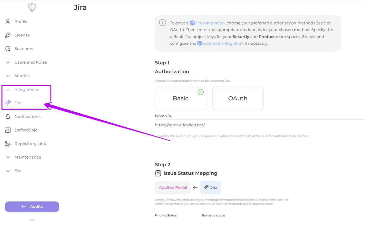 Enable webhook integration: Activate real-time communication and updates between AppSec portal and Jira by toggling the switch