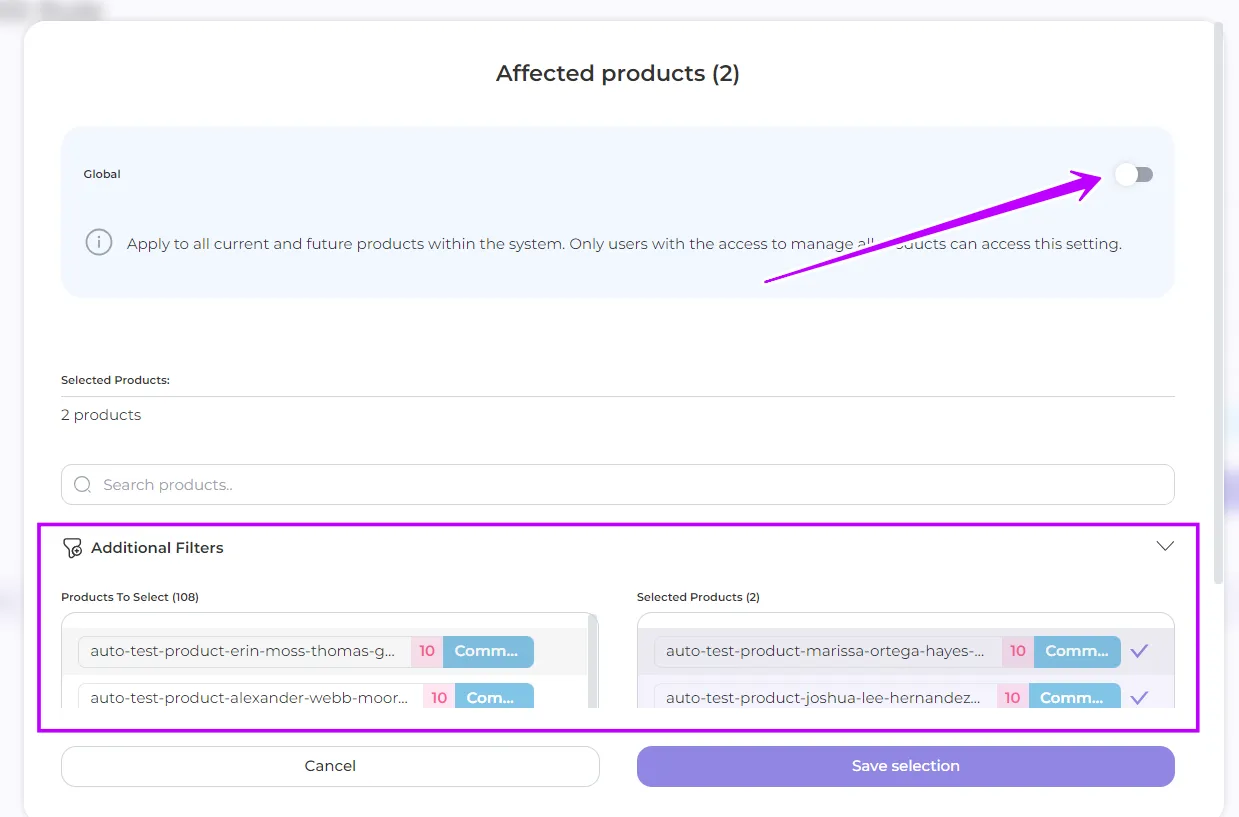 - In the window that opens, select the products to which you want the rules to apply, or leave the default setting to include all your products.