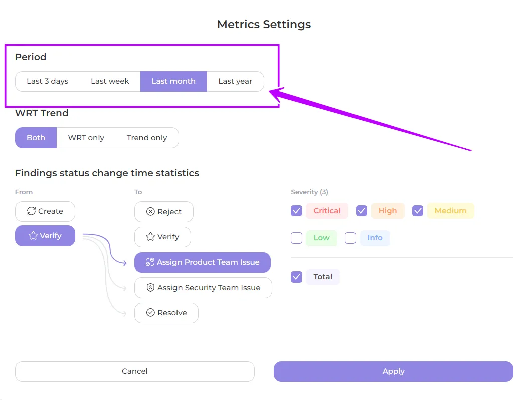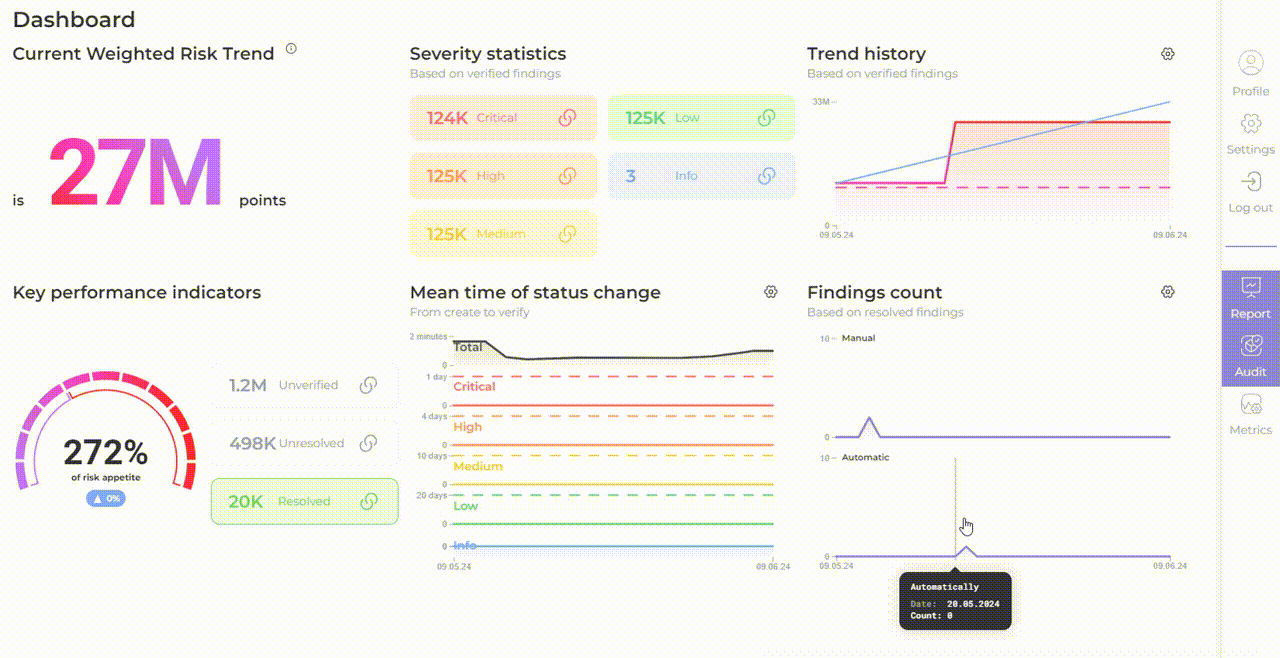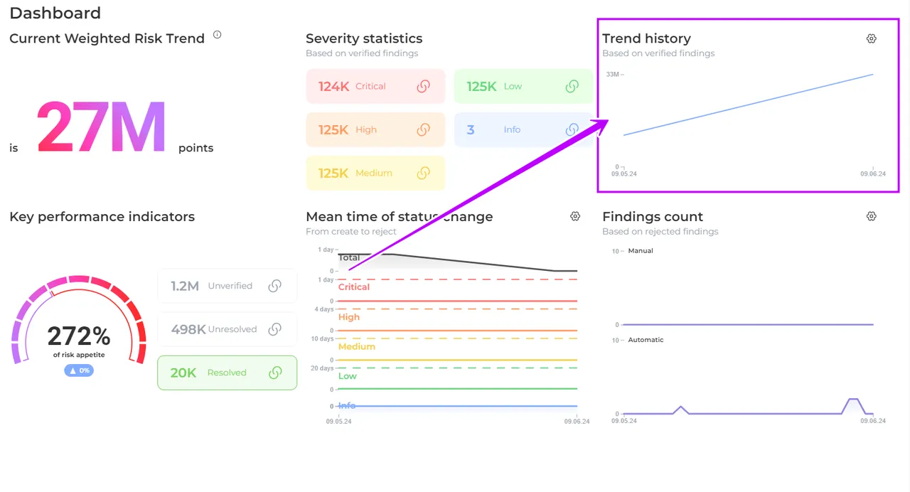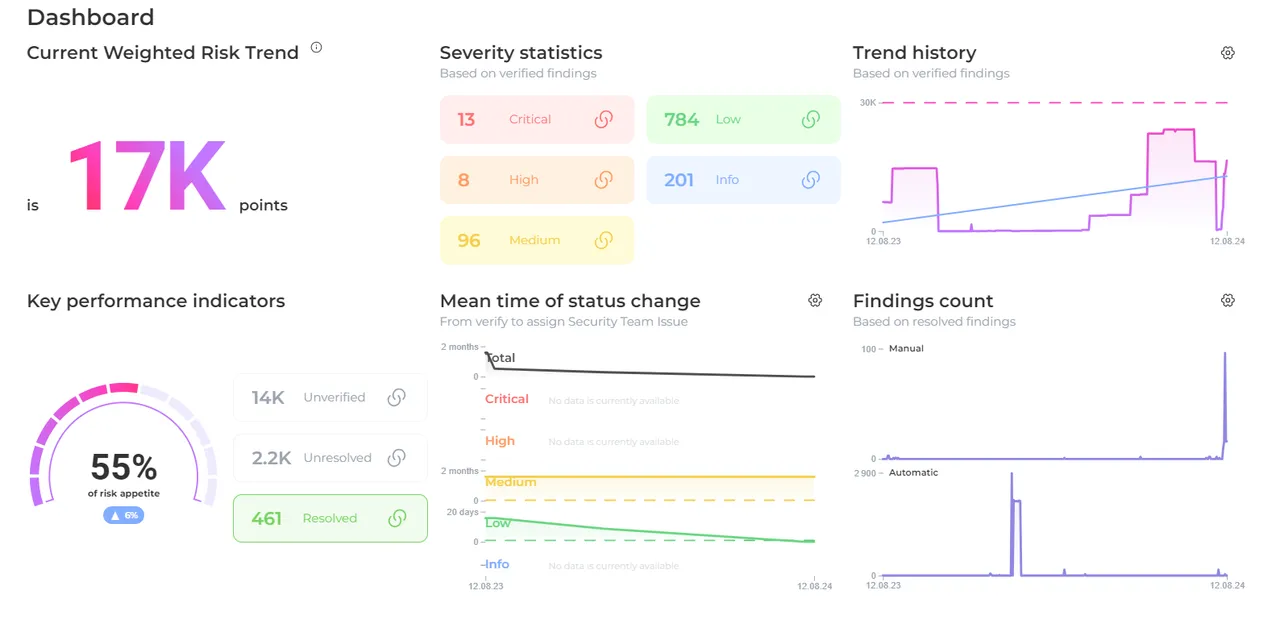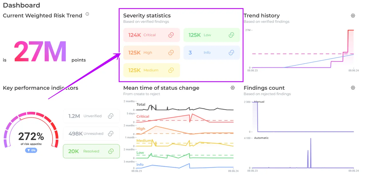 Weighted Risk Trend (WRT) metric empowers organizations to measure and track the state of security in a business-oriented manner. The General WRT is calculated by combining the WRT of each product, taking into account their respective severity weights, findings count, and business criticality assessments.