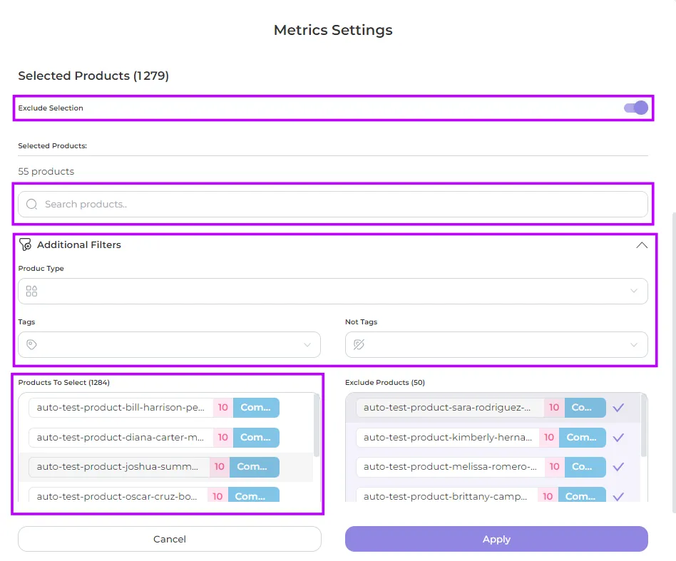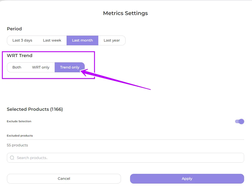 Select the products for which you want to see data on the chart by selecting them from the Products to Select section. You can search, filter (by product type, included or excluded tag) and include or exclude selected products from the data display by moving the Exclude Selection slider.