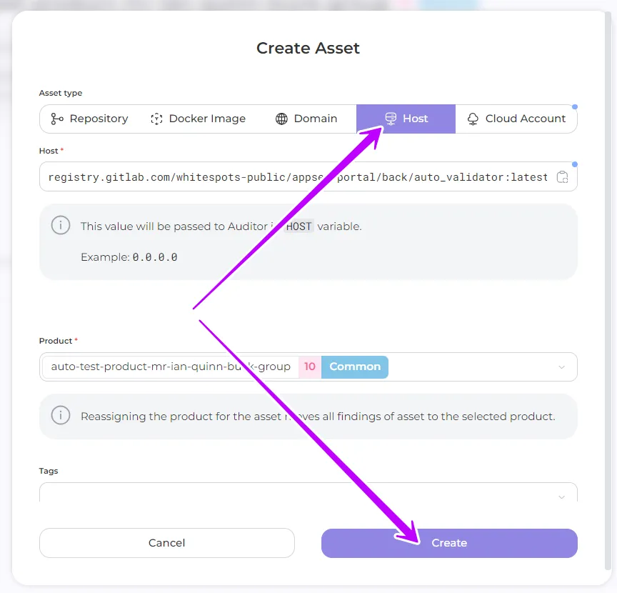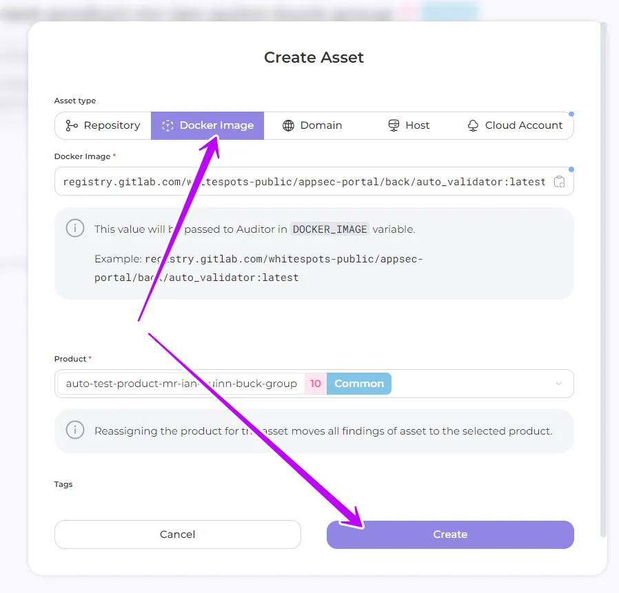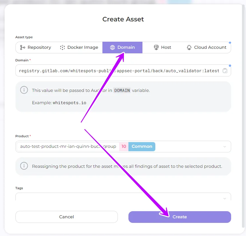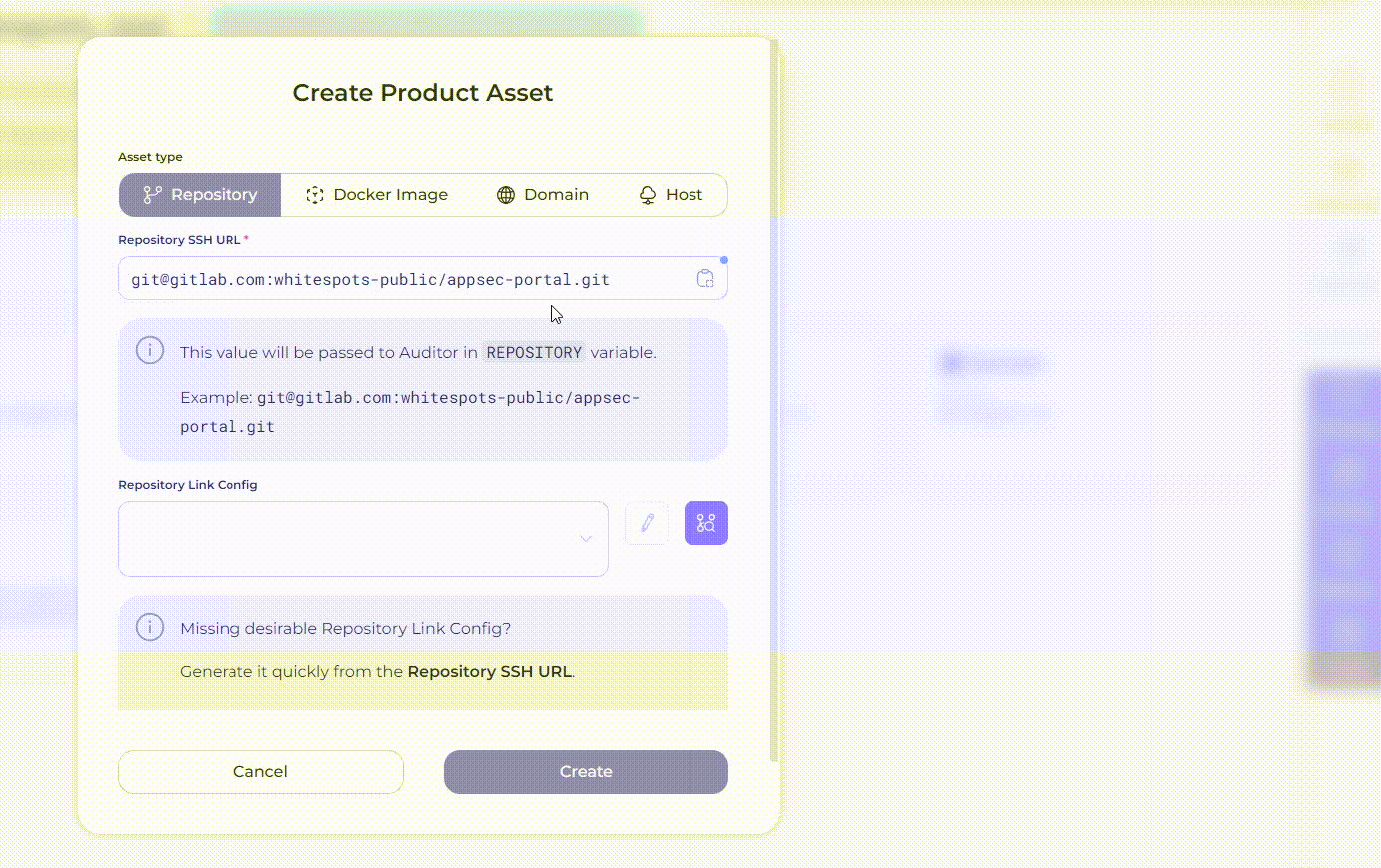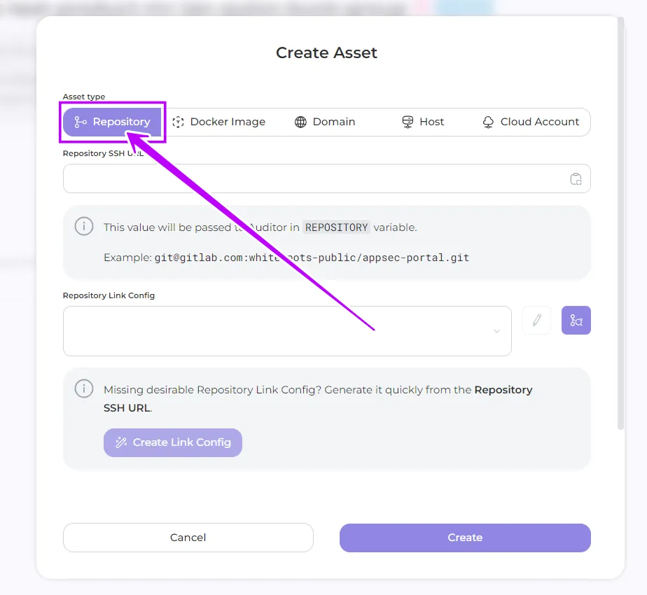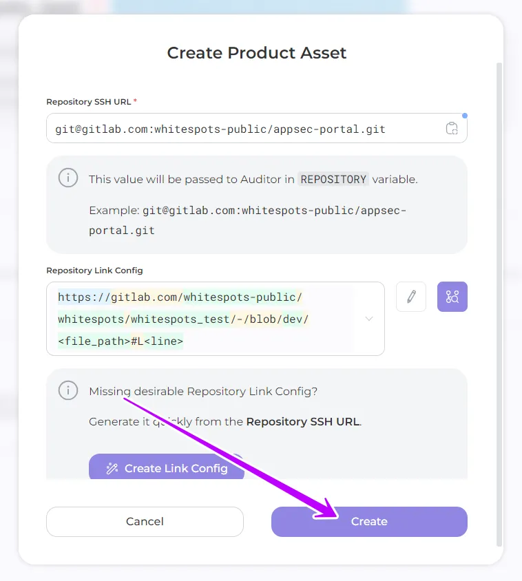 - Repository SSH URL: enter the address of your repository in a specific format, for example: git@gitlab.com:whitespots-public/appsec-portal.git