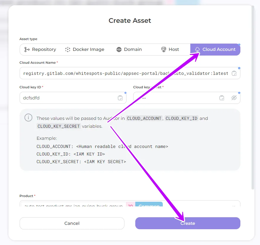 In the Cloud Account tab enter the address of the cloud account name, Cloud key ID and Cloud key secret where your product is located and click Create