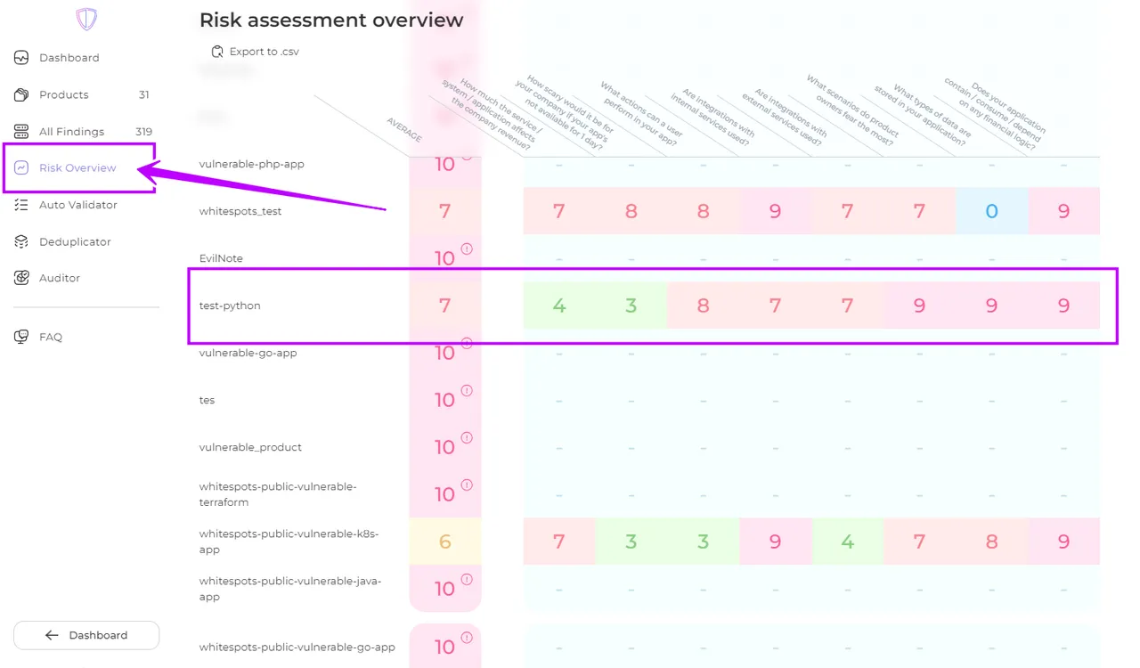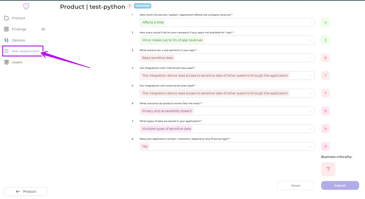 To view the results of the risk assessment tests, navigate to the Risk Assessment Overview page. Here, the chosen answers in these tests or manually settings are displayed for each product, along with the calculated business criticality value based on those answers.