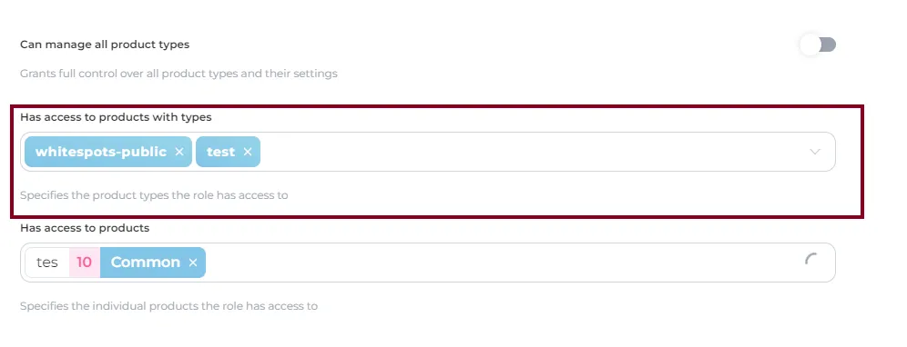 - Consider the specific product types or individual product that should be accessible to users assigned to this role.