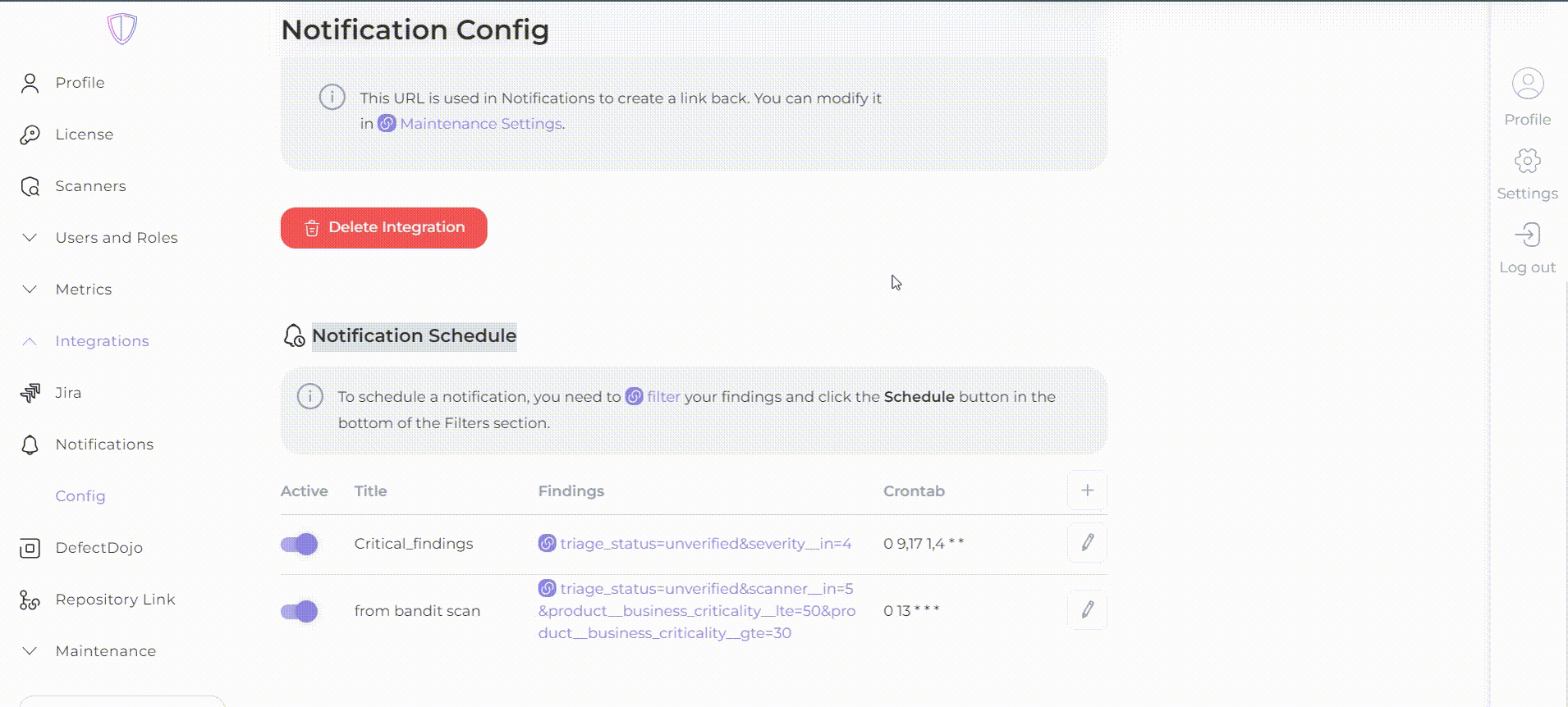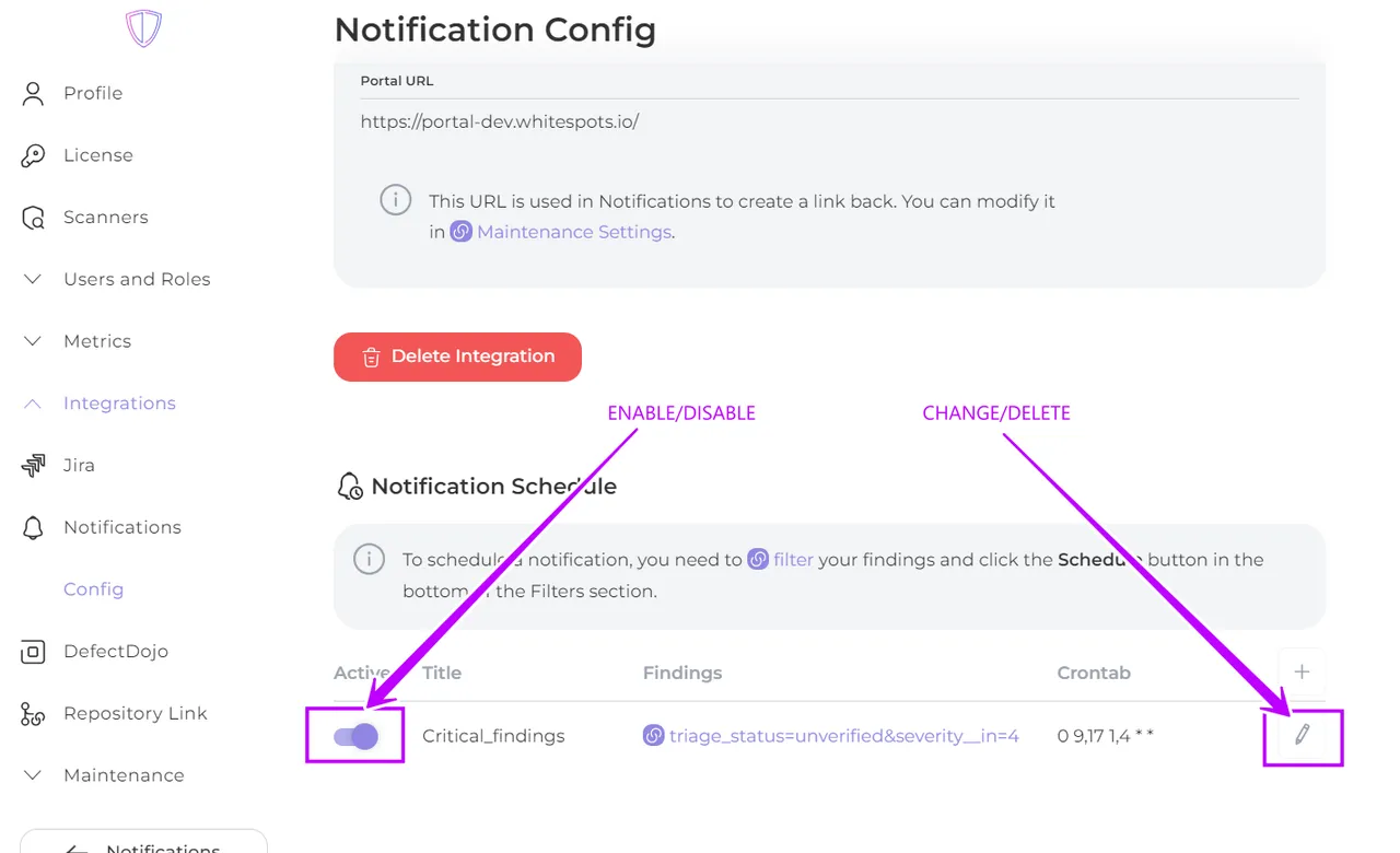 In the configuration of the integrated notification service, you can manage the activation or deletion of created notification types (schedules).