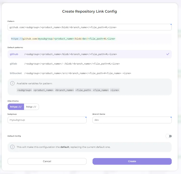 - select the URL pattern of your Git hosting service: choose from the Example patterns provided (available for GitHub, GitLab and Bitbucket) or create a new one in Pattern field;