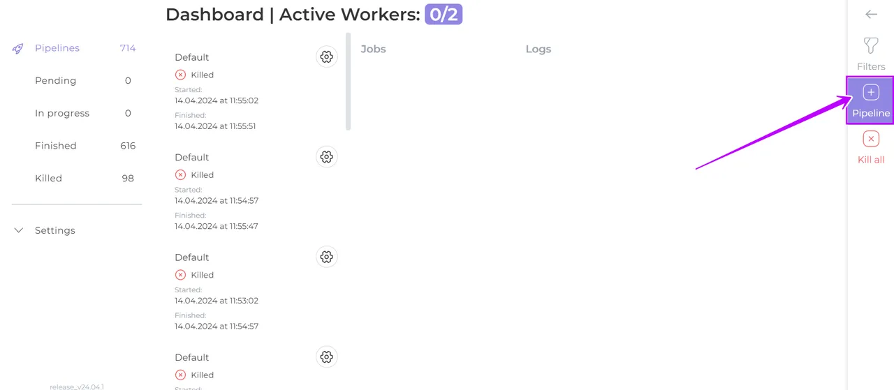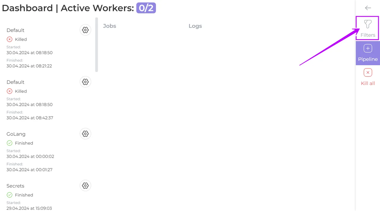 You can also filter the available pipelines by clicking on the filter button in the right panel.