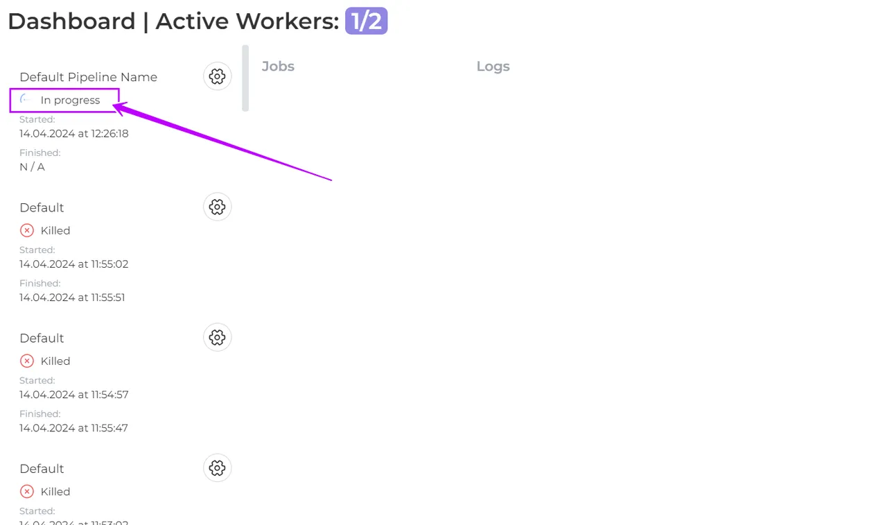 After all the jobs in your pipeline have finished their work, the status of the Pipeline will change from In progress to Finished