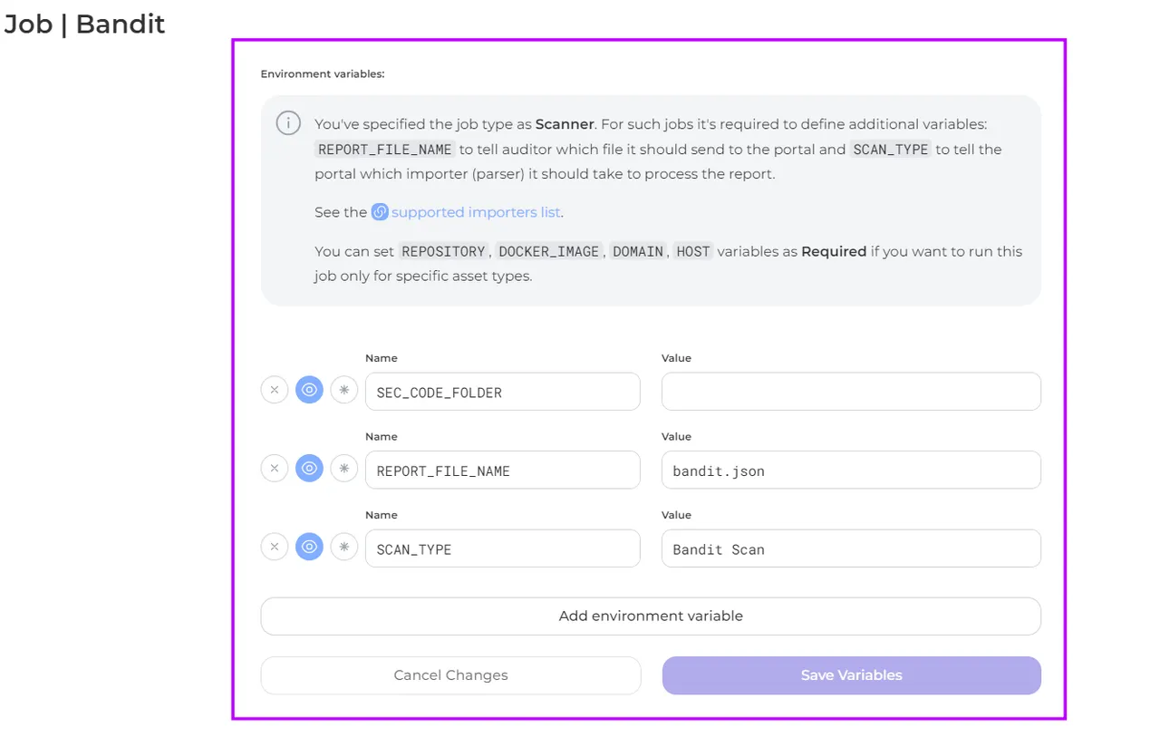 Mandatory environment variables for each job type Scanner: